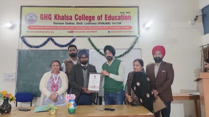 ਗੁਰੂਸਰ ਸੁਧਾਰ( ਜਗਰੂਪ ਸਿੰਘ ਗਰੇਵਾਲ ਸੁਧਾਰ):ਜੀ.ਐਚ.ਜੀ. ਖਾਲਸਾ ਕਾਲਜ ਆਫ ਐਜੂਕੇਸ਼ਨ, ਗੁਰੂਸਰ ਸਧਾਰ ਵਿਖੇ ਕਾਲਜ ਕੈਂਪਸ ਵਿੱਚ ‘ਯੂਨੀਸੈਫ ਦਿਵਸ’ ਮਨਾਇਆ ਗਿਆ। ਇਸ ਮੌਕੇ ਕਾਲਜ ਦੇ ਰੈੱਡ ਰਿਬਨ ਕਲੱਬ ਅਤੇ ਲੈਂਗੂਏਜ ਕਲੱਬਾਂ ਵੱਲੋਂ ਵਿਸ਼ੇਸ਼ ਲੈਕਚਰ ਕਰਵਾਇਆ ਗਿਆ। ਜਗਪਾਲ ਸਿੰਘ ਸਿਵੀਆਂ ਪ੍ਰੈਸ ਰਿਪੋਰਟਰ “ਅਜੀਤ”, ਸ਼੍ਰੀਮਤੀ ਬਿੰਦੂ ਉੱਪਲ, ਪ੍ਰੈਸ ਰਿਪੋਰਟਰ “ਦੈਨਿਕ ਜਾਗਰਣ”, ਸ: ਹਰਪ੍ਰੀਤ ਸਿੰਘ ਲਾਡੀ, ਪ੍ਰੈਸ ਰਿਪੋਰਟਰ, “ਪੰਜਾਬੀ ਜਾਗਰਣ” ਅਤੇ ਵੈੱਬ ਚੈਨਲ ਤੋਂ ਸ: ਜਗਰੂਪ ਸਿੰਘ ਇਸ ਮੌਕੇ ’ਤੇ ਵਿਸ਼ੇਸ਼ ਸ੍ਰੋਤ ਵਿਅਕਤੀ ਸਨ। ਸਮਾਗਮ ਦੀ ਸ਼ੁਰੂਆਤ ਕਾਲਜ ਸ਼ਬਦ ’’ਦੇਹ ਸਿਵਾ ਬਰ ਮੋਹਿ ਇਹੈ’’ ਨਾਲ ਹੋਈ। ਪੰਜਾਬੀ ਵਿਭਾਗ ਤੋਂ ਡਾ. ਜਗਜੀਤ ਸਿੰਘ ਨੇ ਯੂਨੀਸੈੱਫ ਦਿਵਸ ਬਾਰੇ ਸੰਖੇਪ ਜਾਣਕਾਰੀ ਦਿੱਤੀ। ਉਪਰੰਤ ਕਾਲਜ ਦੇ ਪ੍ਰਿੰਸੀਪਲ ਡਾ. ਪਰਗਟ ਸਿੰਘ ਗਰਚਾ ਵੱਲੋਂ ਬੁਲਾਰਿਆਂ ਦਾ ਰਸਮੀ ਸਵਾਗਤ ਕੀਤਾ ਗਿਆ। ਸ: ਜਗਪਾਲ ਸਿੰਘ ਨੇ ਯੂਨੀਸੈਫ ਦਿਵਸ ਮਨਾਉਣ ਦੀ ਮਹੱਤਤਾ ‘ਤੇ ਵਿਦਿਆਰਥੀਆਂ ਨਾਲ ਗੱਲਬਾਤ ਕਰਦੇ ਹੋਏ ਕਿਹਾ ਕਿ ਯੂਨੀਸੈਫ, ਜਿਸ ਨੂੰ ਸੰਯੁਕਤ ਰਾਸ਼ਟਰ ਚਿਲਡਰਨ ਐਮਰਜੈਂਸੀ ਫੰਡ ਵੀ ਕਿਹਾ ਜਾਂਦਾ ਹੈ, ਹਰ ਸਾਲ 11 ਦਸੰਬਰ ਨੂੰ ਵਿਸ਼ਵ ਭਰ ਵਿੱਚ ਹਰ ਬੱਚੇ ਦੇ ਬਿਹਤਰ ਭਵਿੱਖ ਦੀ ਕਲਪਨਾ ਕਰਨ ਲਈ ਮਨਾਇਆ ਜਾਂਦਾ ਹੈ। ਯੂਨੀਸੈਫ 190 ਤੋਂ ਵੱਧ ਦੇਸ਼ਾਂ ਅਤੇ ਖੇਤਰਾਂ ਵਿੱਚ ਬੱਚਿਆਂ ਦੀਆਂ ਜਾਨਾਂ ਬਚਾਉਣ, ਉਹਨਾਂ ਦੇ ਅਧਿਕਾਰਾਂ ਦੀ ਰੱਖਿਆ ਕਰਨ ਅਤੇ ਉਹਨਾਂ ਦੀ ਸਮਰੱਥਾ ਨੂੰ ਪੂਰਾ ਕਰਨ ਵਿੱਚ ਮਦਦ ਕਰਨ ਲਈ, ਬਚਪਨ ਤੋਂ ਲੈ ਕੇ ਕਿਸ਼ੋਰ ਅਵਸਥਾ ਤੱਕ ਕੰਮ ਕਰਦਾ ਹੈ। ਸ਼੍ਰੀਮਤੀ ਬਿੰਦੂ ਉੱਪਲ ਨੇ ਉਜਾਗਰ ਕੀਤਾ ਕਿ ਵਿਦਿਅਕ ਸੰਸਥਾਵਾਂ ਨੂੰ ਹਰ ਬੱਚੇ ਦੇ ਅਧਿਕਾਰਾਂ, ਸੁਰੱਖਿਅਤ ਆਸਰਾ, ਸਹੀ ਪੋਸ਼ਣ, ਆਫ਼ਤਾਂ ਅਤੇ ਸੰਘਰਸ਼ਾਂ ਤੋਂ ਬਾਲ ਸੁਰੱਖਿਆ, ਸਮਾਨਤਾ, ਸਿੱਖਿਆ, ਸਮਾਜਿਕ ਸ਼ਮੂਲੀਅਤ ਦੀ ਮੰਗ ਕਰਨ ਵਾਲੇ ਨਾਅਰੇ, ਕਵਿਤਾਵਾਂ ਲਿਖਣ ਅਤੇ ਪੋਸਟਰ ਤਿਆਰ ਕਰਨ ਵਰਗੀਆਂ ਗਤੀਵਿਧੀਆਂ ਦਾ ਆਯੋਜਨ ਕਰਨਾ ਚਾਹੀਦਾ ਹੈ। ਉਨ੍ਹਾਂ ਕਿਹਾ ਕਿ ਇਹ ਗਤੀਵਿਧੀਆਂ ਨਾ ਸਿਰਫ਼ ਵਿਸ਼ਵ ਭਰ ਦੇ ਸਮਾਜਾਂ ਵਿੱਚ ਯੂਨੀਸੈਫ ਦੀ ਭੂਮਿਕਾ ਬਾਰੇ ਜਾਗਰੂਕਤਾ ਪੈਦਾ ਕਰਦੀਆਂ ਹਨ, ਸਗੋਂ ਇਸ ਦੇ ਨਾਲ ਹੀ ਵਿਦਿਆਰਥੀਆਂ ਨੂੰ ਇਹ ਵੀ ਅਹਿਸਾਸ ਹੁੰਦਾ ਹੈ ਕਿ ਕਿਵੇਂ ਦੁਨੀਆ ਦੇ ਵੱਖ-ਵੱਖ ਹਿੱਸਿਆਂ ਵਿੱਚ ਬੱਚਿਆਂ ਦੇ ਅਧਿਕਾਰਾਂ ਦੀ ਉਲੰਘਣਾ ਹੁੰਦੀ ਹੈ ਅਤੇ ਉਨ੍ਹਾਂ ਦੀ ਸੁਰੱਖਿਆ ਅਤੇ ਹੱਲ ਕਿਵੇਂ ਕੀਤਾ ਜਾ ਸਕਦਾ ਹੈ। ਸ: ਜਗਰੂਪ ਸਿੰਘ ਨੇ ਯੂਨੀਸੈਫ ਦਿਵਸ 2023 ਦੇ ਮੁੱਖ ਪ੍ਰਸੰਗ ਭਾਵ ’’ਹਰ ਬੱਚੇ ਲਈ, ਹਰ ਅਧਿਕਾਰ” ਨੂੰ ਉਜਾਗਰ ਕੀਤਾ ਜਦਕਿ ਸ.ਹਰਪ੍ਰੀਤ ਲਾਡੀ ਨੇ ਵਿਦਿਆਰਥੀਆਂ ਨਾਲ 2023 ਲਈ ਯੂਨੀਸੈਫ ਦੀ ਯੋਜਨਾ ਸਾਂਝੀ ਕੀਤੀ। ਕਾਲਜ ਦੇ ਰੈੱਡ ਰੀਬਨ ਕਲੱਬ ਇੰਚਾਰਜ ਐਸੋਸੀਏਟ ਪ੍ਰੋਫ਼ੈਸਰ ਡਾ. ਮੰਨੂੰ ਚੱਢਾ ਜੀ ਨੇ ਸਾਰੇ ਮੁੱਖ ਮਹਿਮਾਨਾਂ ਦਾ ਧੰਨਵਾਦ ਕੀਤਾ। ਸਮਾਗਮ ਦੀ ਸਮਾਪਤੀ ਰਾਸ਼ਟਰੀ ਗੀਤ ਦੇ ਗਾਇਨ ਨਾਲ ਹੋਈ।